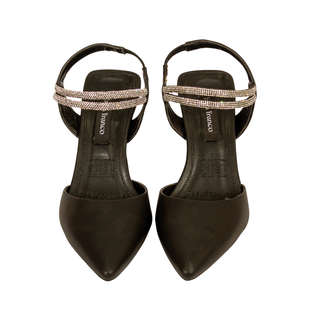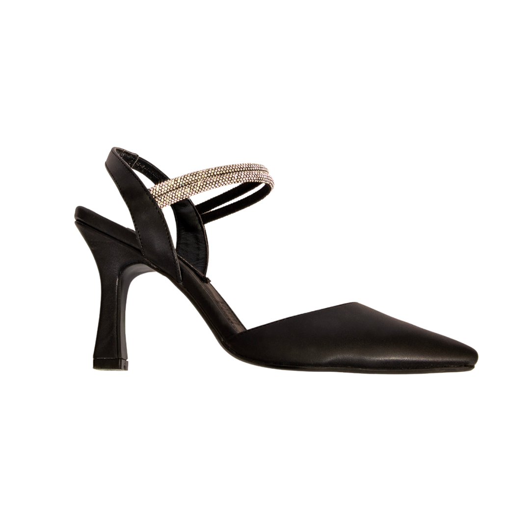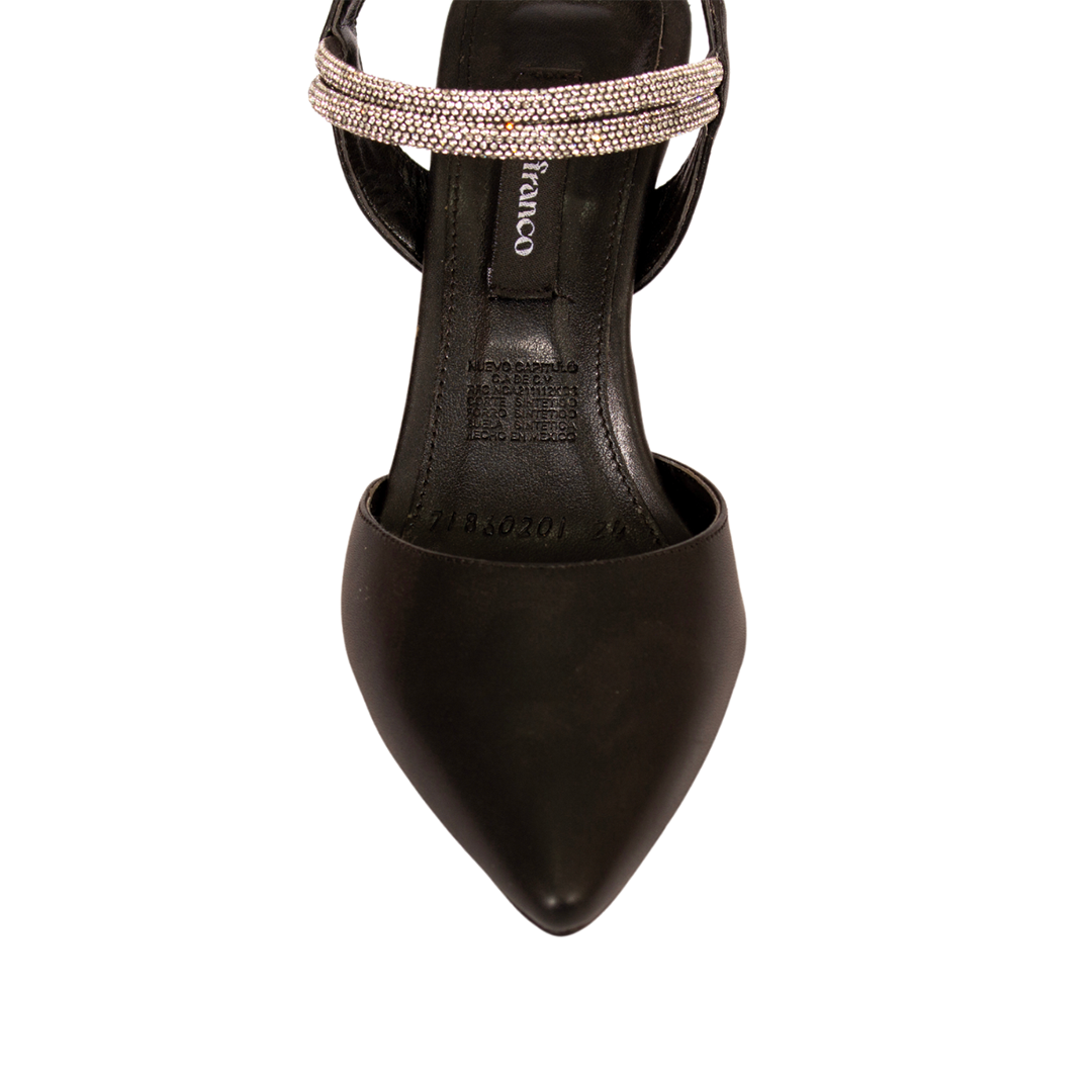Elaboradas en un sofisticado color negro, estas zapatillas ofrecen un equilibrio perfecto entre estilo y soporte. Su puntal adornado con una delicada tira plateada añade un toque de glamour a tu look, mientras que la tira trasera garantiza un ajuste seguro y cómodo.